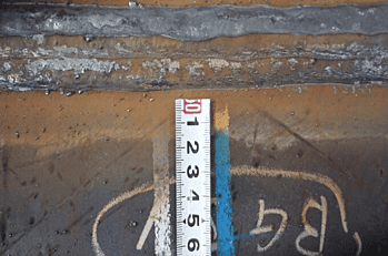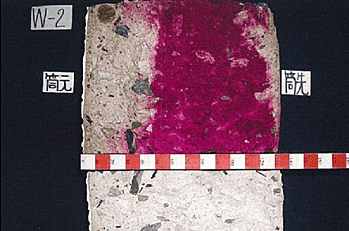 この調査により、非破壊によるコンクリート内部の鉄筋位置の把握、鉄筋の被り厚測定鉄筋のピッチ、破壊試験によるコンクリート強度測定、中性化試験、斫りによる鉄筋確認。
